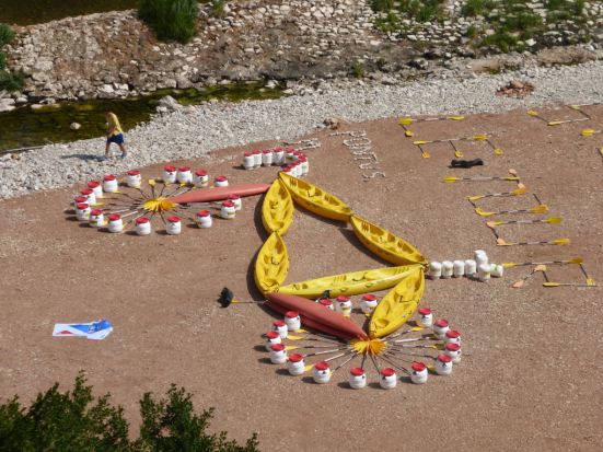 L'équipe de MEJEAN CANOË et l'ingénieux Gaël s'étaient mobilisés pour le passage du Tour de France en fabriquant un vélo avec canoës, bidons et pagaies, en prévision des images prises de l'hélico. Ce dernier a un peu boudé Ste Enimie, dommage....