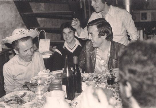 De droite à gauche : Emile Malaval - Marc (serveur aux Gorges) - Claude Paradan - Michel Hugonnet (debout), Dédé Bancillon (de dos).... Ils fêtaient les 40 ans de Christian !