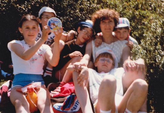 Xiane et quelques-uns de ses élèves en 1985 : Sonia et Yannick, Julien, Gauthier, Alexis en route pour la ferme où ils allaient passer qq jours en autonomie