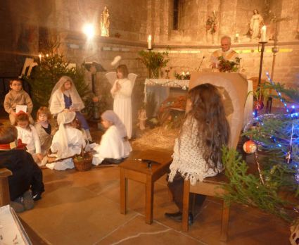 Enfin! 21 heures ! Les cloches sonnent à toute volée, annonçant la messe de NOËL.Nous allons assister à la plus belle messe de l'année, celle qui va nous aider à vivre notre foi chrétienne..Le père Nurit reçoit ses paroissiens un par un avec un mot pour tous et sa gentillesse habituelle...il est très ému de voir l'église bien pleine et d'accueillir sa famille descendue tout exprès de St Rome de Dolan ! Charles nous joue « Minuit chrétien »à L’harmonica. Quelle belle émotion !...Les enfants du catéchisme, dignes et bien costumés, entourés de leurs catéchistes, miment la crèche sous l’œil attendri des fidèles...Nous entonnons .des chants joyeux annonçant la bonne nouvelle! : " Il est né le divin enfant ", " Les anges dans nos campagnes » « Viens à la crèche »...Quel bonheur ! ...