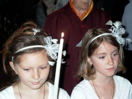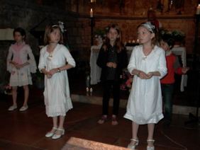 Dimanche 27 mai, Clémence et Clothilde,deux soeurs jumelles toutes de blanc vétues, entourées de leur famille au grand complet et chaperonnées par Véronique, leur catéchiste, ont effectué leur première communion sous l'oeil attentif de leurs camarades du catéchisme, lors de la messe dominicale de Pentecôte célébrée par le Père René Nurit . Une messe magnifique devant une nombreuse assemblée très émue : "Vous rencontrerez sans doute des difficultés dans votre vie chrétienne. C'est normal!C'est tout au long de sa vie que l'on doit faire preuve de foi.Surtout, n'ayez pas peur! vous n'êtes pas seules sur le chemin, Dieu vous aime depuis toujours et il ne vous oubliera jamais."a dit le père aux fillettes avant le "traditionnel"chant final mimé par tous les enfants .
