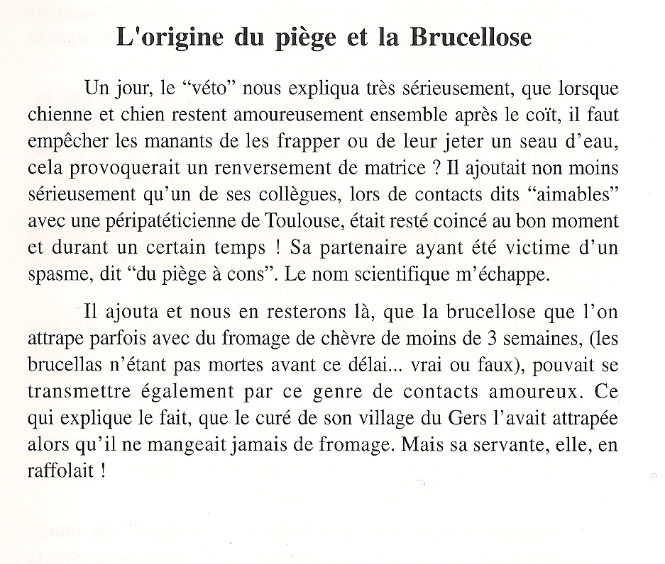 Le curé de la paroisse, revêtu de sa redingote noire et de son bonnet carré, passait parfois dans les parages, au cours de sa promenade quotidienne, en lisant son bréviaire. Lorsqu’il l’apercevait, Calixte s’exclamait à l’adresse de Gusteto : « té ; beijo lou groupatas qué passo » (tiens ; regarde le gros corbeau qui passe). Il s’affairait, alors, sur sa besogne et se penchait en avant pour n’avoir pas à le saluer.