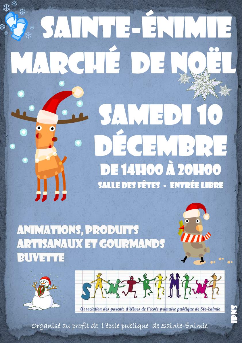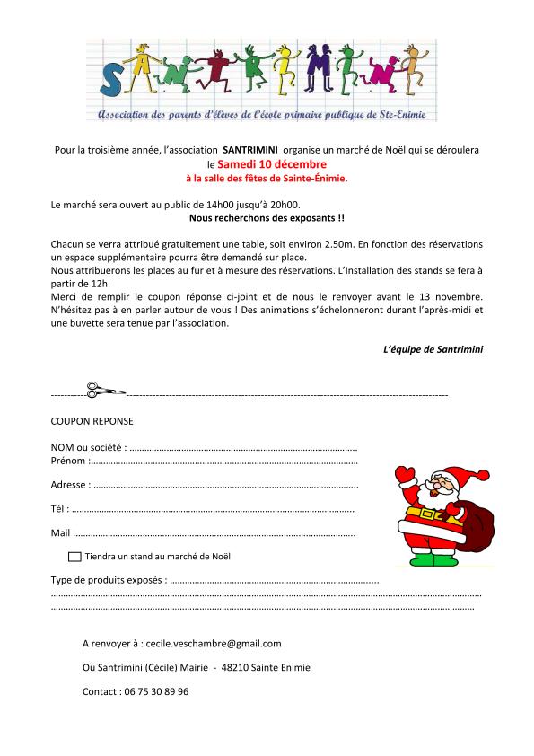 Pour la troisième année, l’association SANTRIMINI organise un marché de Noël au profit de l’école primaire publique de Ste Enimie. Il se déroulera le Samedi 10 décembre à la salle des fêtes de Sainte-Énimie. . Ce marché sera ouvert au public de 14h00 jusqu’à 20h00.Des animations s’échelonneront durant l’après-midi et une buvette sera tenue par l’association.